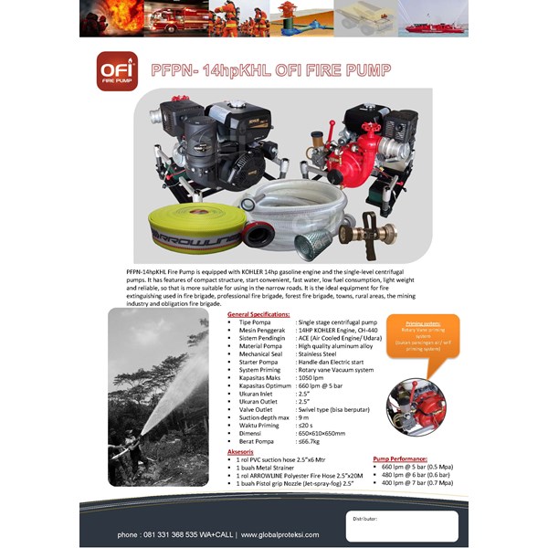 Pompa Pemadam Kebakaran Portable PFPN-14hp-Kohler bertipe single centrifugal & dilengkapi mesin KOHLER CH-440 4-stroke. Sangat sesuai dipakai dalam pemadaman kebakaran ditempat tempat yang susah dijangkau, seperti di daerah perbukitan atau harus melewati gang-gang kecil yang tidak mungkin dilakukan fire pump berukuran lebih besar atau mobil damkar.